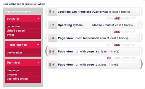 For example, checkout a user segment for users from San Francisco on an iPad who came from techcrunch.com and who visited either page_a or